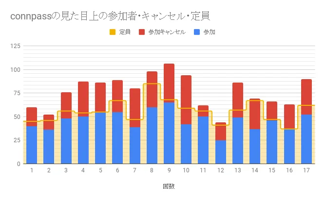 ほぼ毎回定員オーバーしているのが嘘では無いことがわかると思います。 前日夜から、当日夜までのキャンセルが多いことがおわかりいただけると思います。 当日の体調不良、業務状況などがあるとは思いますので、致し方ないことですね。