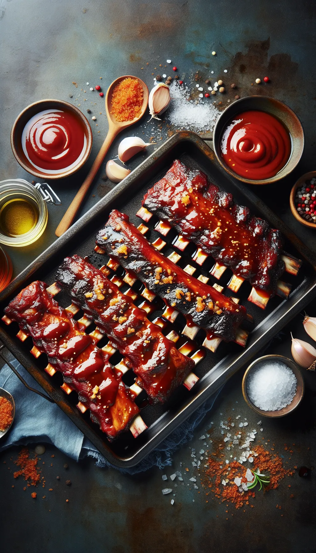 まずは材料を揃えることから始めます。バックリブを用意し、BBQソースの材料もチェック。基本的なソース作りの材料として、ケチャップ大さじ2、ウスターソース、はちみつ、酢、醤油、そしてニンニクを使用します。特にニンニクは、料理全体の風味を引き立てる大事な要素となるので、新鮮なものを選ぶようにしています。