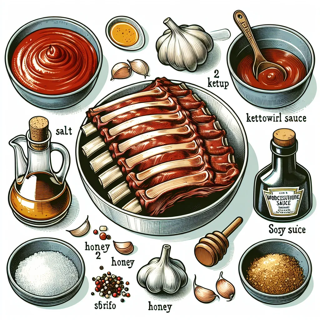 まずは材料を揃えることから始めます。バックリブを用意し、BBQソースの材料もチェック。基本的なソース作りの材料として、ケチャップ大さじ2、ウスターソース、はちみつ、酢、醤油、そしてニンニクを使用します。特にニンニクは、料理全体の風味を引き立てる大事な要素となるので、新鮮なものを選ぶようにしています。