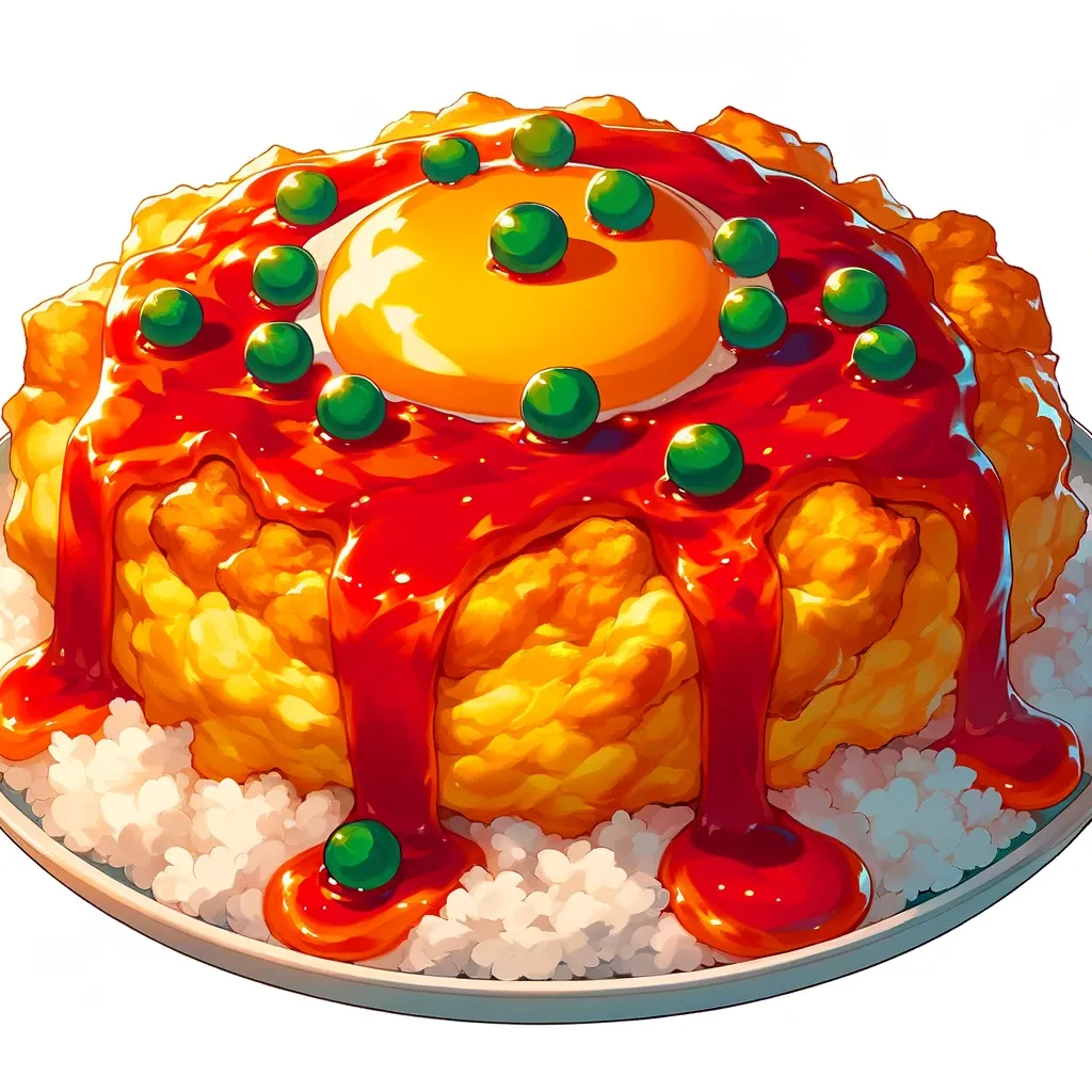 こちらがアニメ調の天津飯のイラストです。この料理はふわふわの軽く揚げたオムレツが白いご飯の上にのせられ、濃厚で光沢のある甘酸っぱいソースがたっぷりかけられています。そのソースは鮮やかな赤橙色で、グリーンピースと細かく切ったネギで飾られ、新鮮さが加えられています。イラストは、金色のオムレツと白いご飯、豊かなソースの魅力的なコントラストを捉え、食欲をそそるビジュアルを作り出しています。他にご要望があればお知らせください。