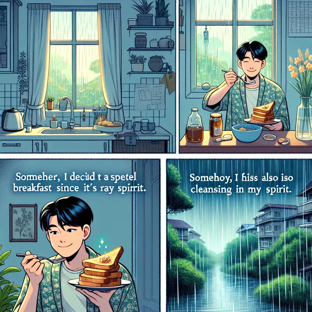朝食としてフレンチトーストを作ることにした。雨の日には特別な朝食を用意するのが、ここ最近の僕のルールだ。甘いシロップとふわふわのパンが心を和ませてくれる。キッチンの窓から外を見ると、雨が木々を洗い流す光景が広がっていた。それがなんとなく、心の中のもやもやを洗い流しているように感じた。