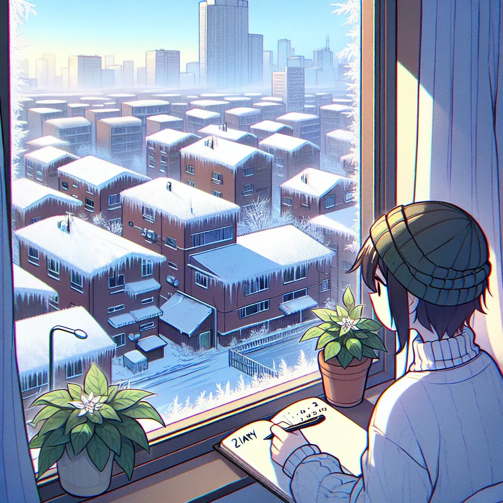 冬の朝は思ったよりも寒いです。今朝も例に漏れず、部屋の中で重ね着をしても寒さが染み込んできました。この時期になると、布団から出るのが一種の冒険と化します。窓の外を見れば、ビルの屋上や歩道に薄っすらと霜が降りており、いかにも冬らしい景色です。同時に、この寒さがなんだか心地よくも感じられる、自分でも不思議な感覚に包まれました。